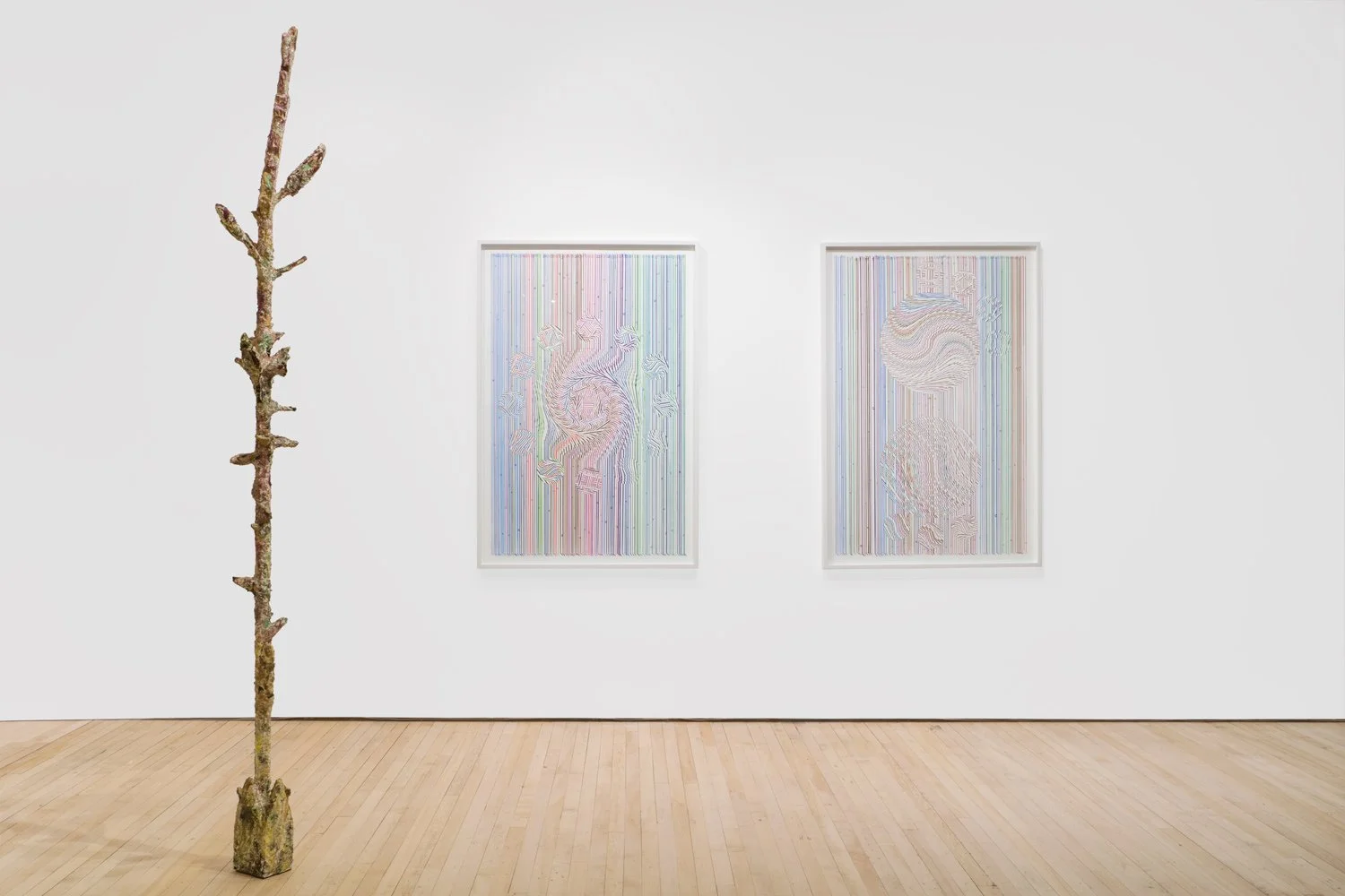 Within the exhibition, nature is approached as a representation of this balance between the material and spiritual worlds; a symbiosis of concurrent light and dark in Sohrevardi’s philosophy. The title of the show, Conjuring Flames, alludes to the continuous struggle for humanity to achieve this sacred balance. These dualities and the presence of nature as well as spiritual beings appear in the artists’ works, installed across intertwined areas of light and dark throughout the space. The range of mediums includes works on paper, painting, sculpture, installation and video, thereby reflecting the breadth of traditions, both traditional and contemporary, with which the artists engage and transform.