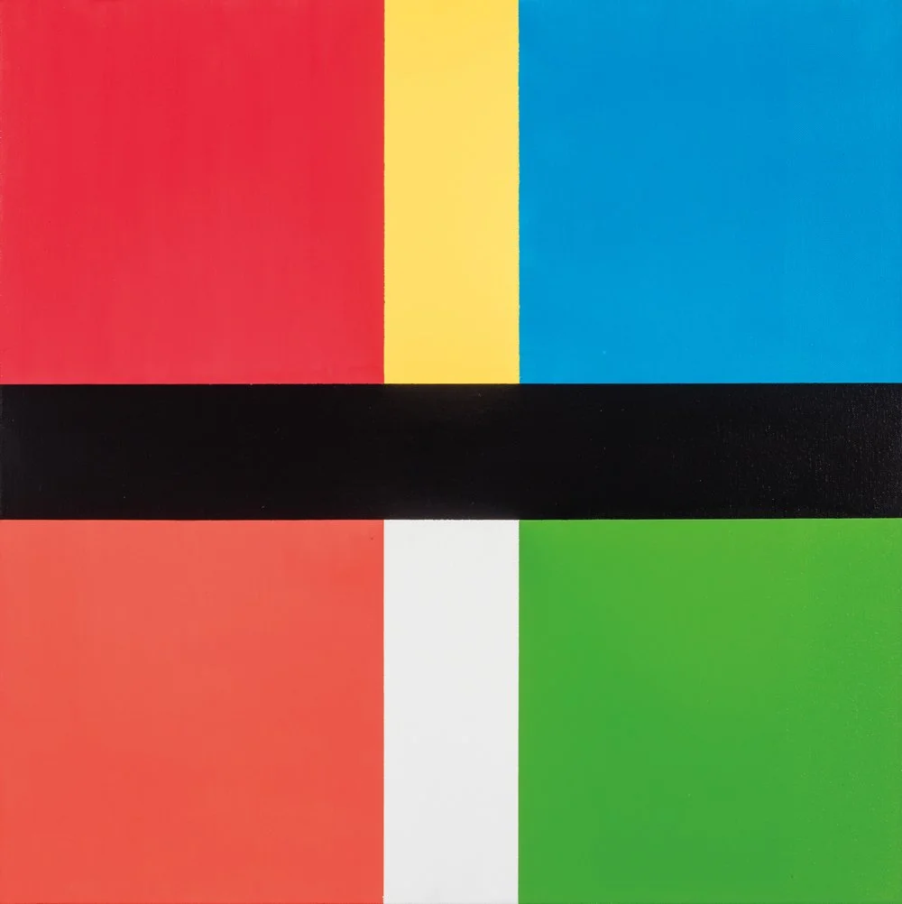 Mystery surrounds the final 1800 works, exacerbated by the fact that the series represents a departure for the artist. Each picture is structurally identical with four squares separated by a broad horizontal bar crossing a vertical one, creating the illusion of depth through superimposition with the horizontal bar on top of the vertical. The spatial play of composition in the last works was not a typical feature of Poldaas’ earlier work, which emphasized the flatness of the picture plane and the push/pull of various color tonalities. Color is treated differently in the horizontal bars—black, red, dark green, light green, fuchsia or yellow—than in the verticals, which the artist has limited mostly to white, never black, but occasionally yellow, red, or in single cases, dark green, purple and aqua. The composition alternates between forming a two-tone cross or separating the vertical bar into two rectangles by giving each divided section a separate color.