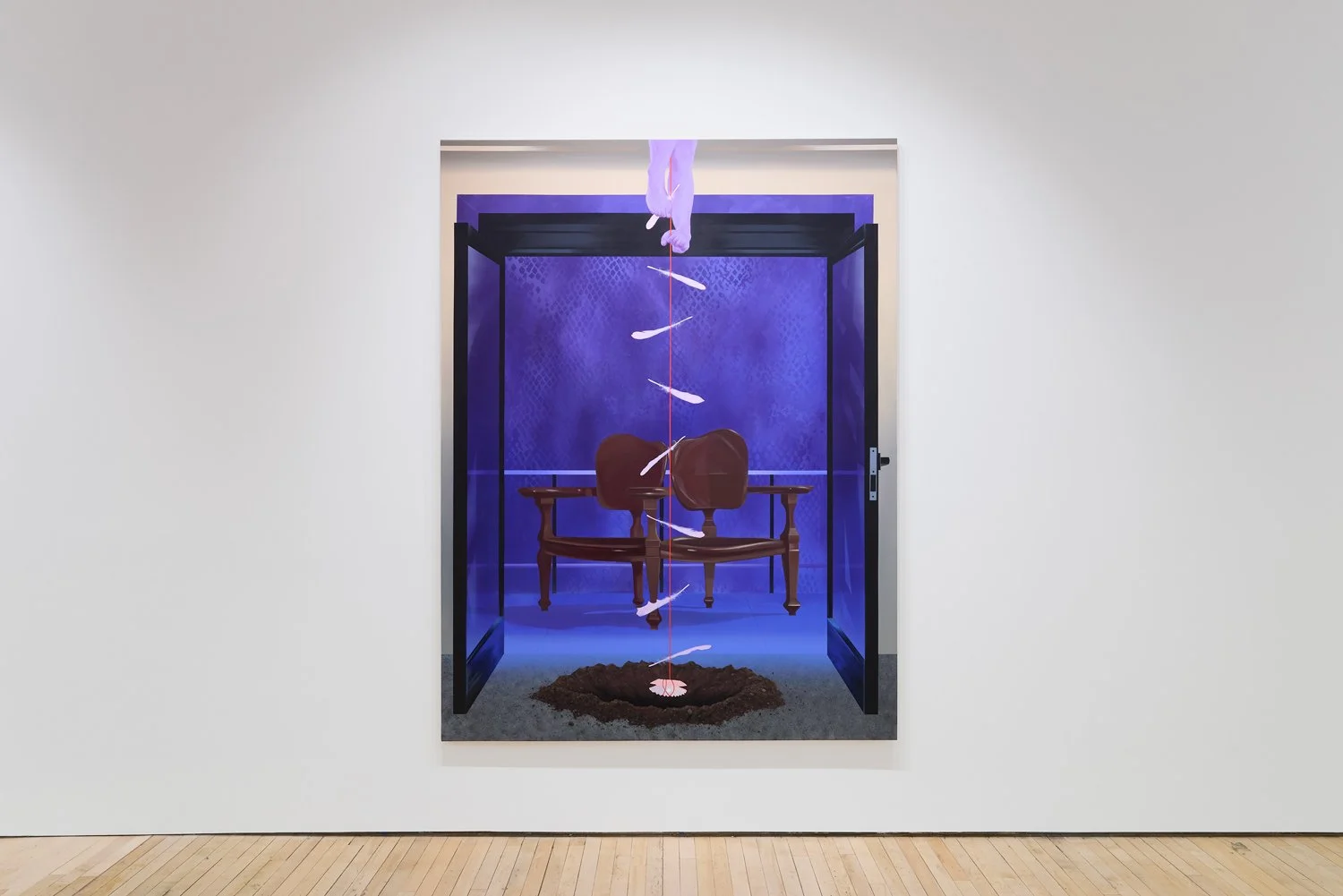 In her work, Ong is interested in recurring themes of healing, grief and longing. Her paintings are the result of a slow and methodical process in which elements are placed judiciously amongst carefully planned compositions. Over the course of several weeks, the artist constructs, deconstructs and reconstructs her paintings; adding and subtracting elements to achieve perfectly ambiguous and hypnagogic scenes. Drafting from fiction just as much as her own experience, Ong weaves elements from her personal memories, dreams and visions with a vocabulary that borrows from popular culture, exalting images pulled from poetry, novels, songs and / or films.