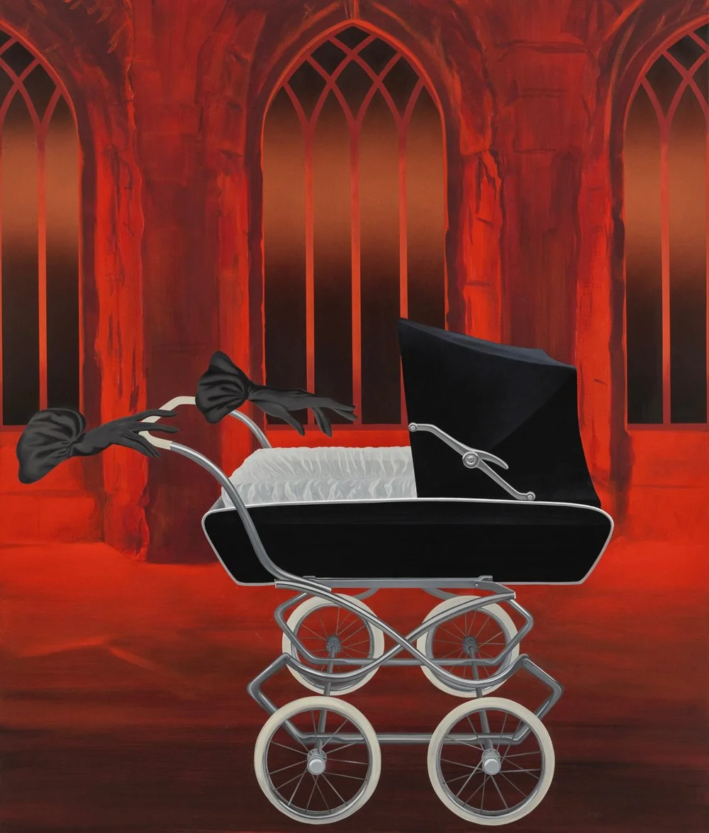 As a result, all types of strange characters populate the artist’s paintings. In Apparatus of The Tongue a hoofed and winged character offers a bowed lock of hair to a water well in the hope of attracting good luck while a floating pair of elegantly gloved hands push a baby stroller in a piece titled Original Joy. In A Spell for Refusal, an ominous cloaked figure is being serenated by a ball-chained violinist-skeleton.