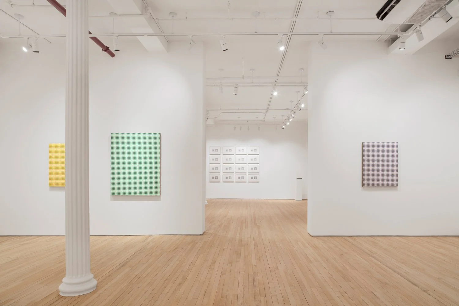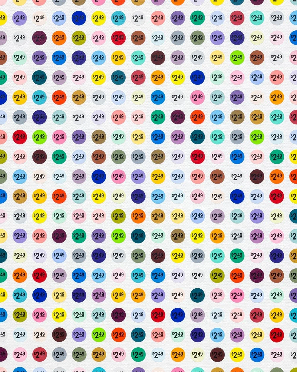 Titled “MSRP,” the shorthand for “Manufacturer's Suggested Retail Price,” the works in Sean Weisgerber’s current Arsenal Contemporary NY exhibition fascinate from both afar and up close. At first glance the works appear to be simple everyday dollar store price stickers stuck onto large canvases — but then looking closer you realize they’ve actually been painted onto the canvas, and not painted slap-dashedly but painted with technical acumen that’s almost thrilling. With a bit of probing, it turns out that the price of the painting is the sum of the painted stickers he has depicted, and that the the piece will acquire its title once it is acquired, by adopting the date of purchase – e.g., APR. 22, 2022. The title codifies that precise moment in time something went from being an object to becoming an art object — an object that now has a new owner.