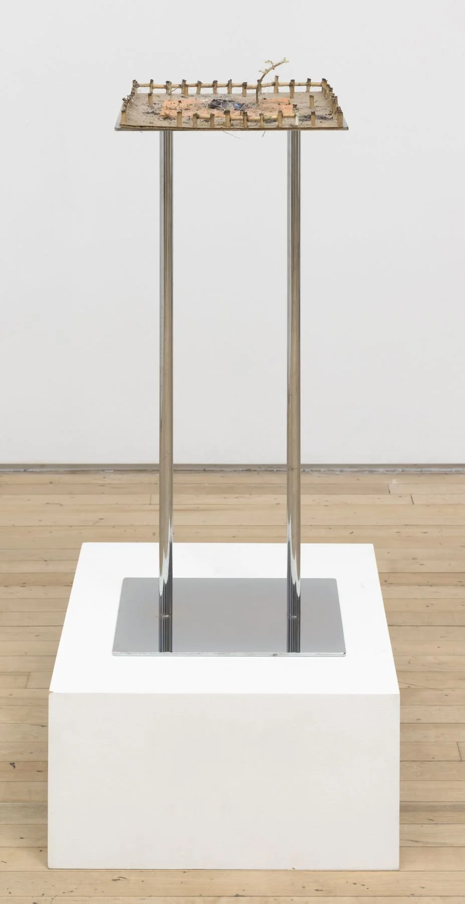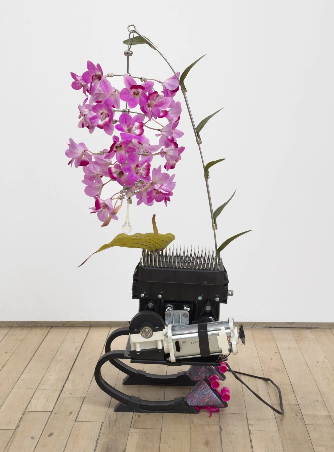 Riding exercise simulator. bird spikes, artificial flowers, wire, rope, monitor riser stand, hardware, glass, mica pigment, doll rollerskates