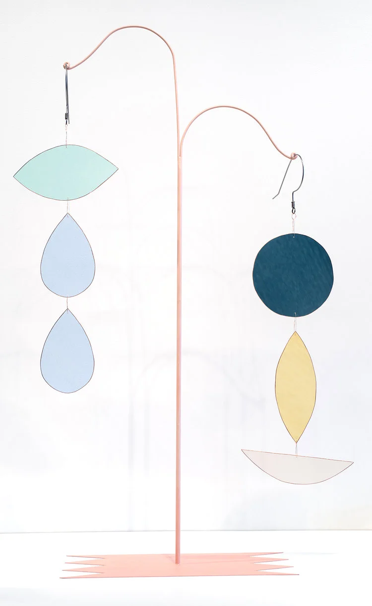 It is said that jewellery says something about a person. Standing nearly ten feet tall, Stained Glass Earrings + Stand (2018) might feel imposing if not for its pastel shapes and slender steel lines. Yet below the soft surface other meanings dwell. On one earring, the shape of an eye discreetly cries light blue tears, hinting at more complex realities below the surface of objects of costume or decoration.
