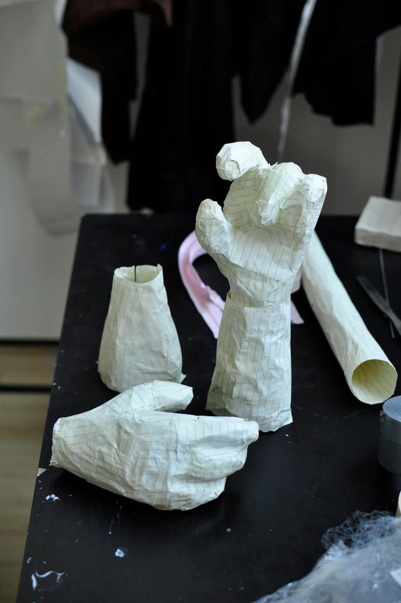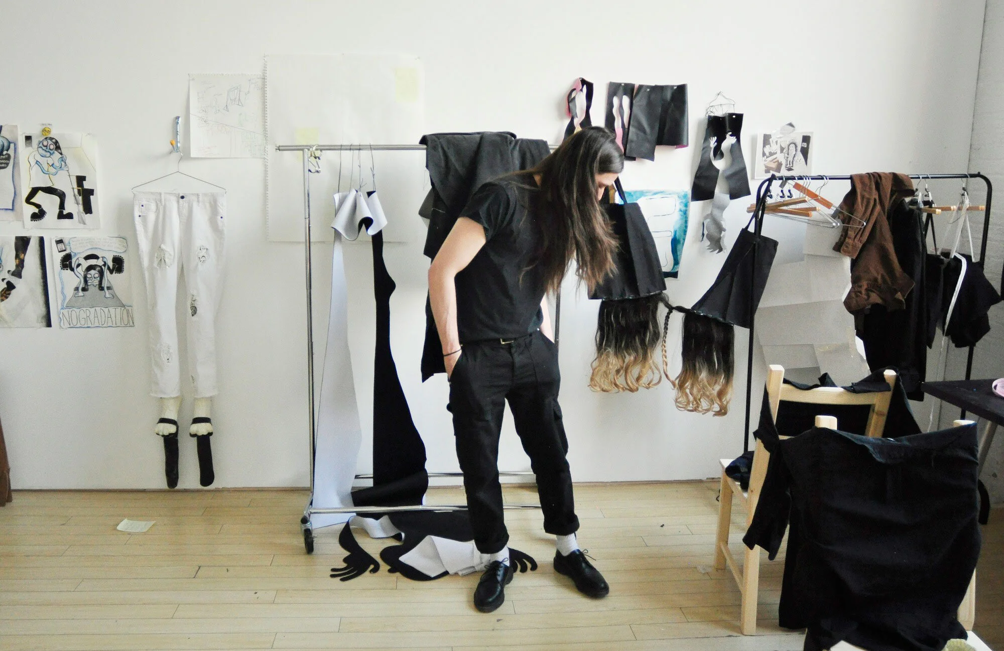 It’s a sunny Thursday afternoon as I head across town to Toronto’s east end and Walter Scott’s studio - a bright room with high ceilings where his works in progress seem camouflaged amid the studio furniture. There are a couple of chairs draped in a split-open black shirt, clothing racks, tote bags and packages of fake hair. Comic-style drawings pinned to the wall feature some of the same motifs as the sculptural works. In them, a character based on the artist himself negotiates with a high level of anxiety a variety of things splitting apart. Scott tells me he’s been exploring Carl Jung’s idea of the shadow self, and the feeling of being made up of conflicting parts, of living in a grey-zone like a constant state of indeterminacy.