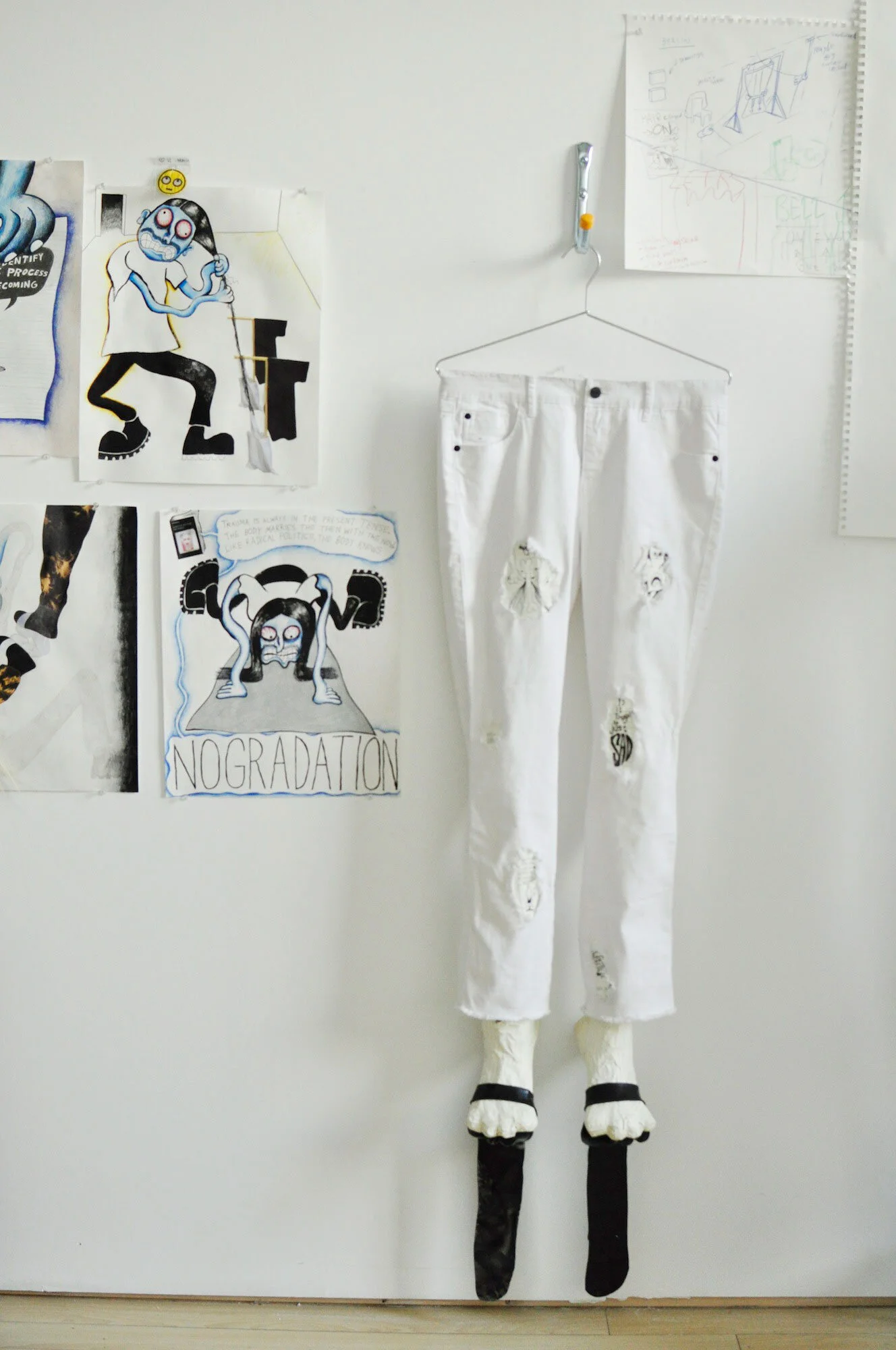 In a well-known anecdote about his youth, Jung believed he was made up of two halves, #1 and #2. Number one was the boy capable of regular activities, while Number two was reclusive, wiser, and steeped in his dream life. In addition to the idealized Number two was the shadow, or dark side of the individual, full of undesirable qualities they repress and try to hide. Several motifs in Scott’s recent work evoke this split personality including tall boots that trail behind a character, elongated flip-flops that function as a shadow, ghost figures, and conjoined articles of clothing. Pointing to the body in various material ways by using accessories, clothes, and papier-mâché hands and feet, he elucidates a world of multiple personalities, and self-doubt.