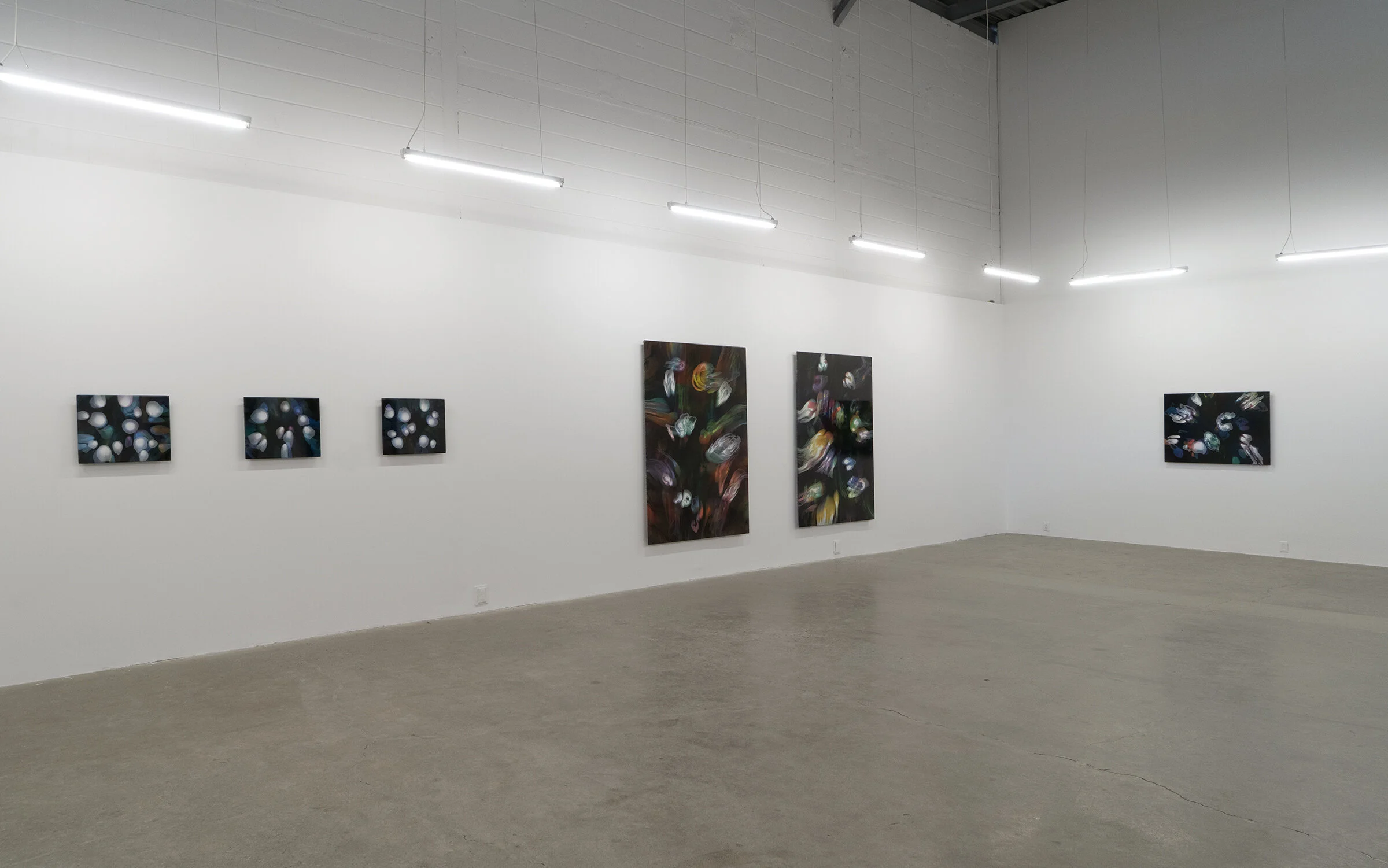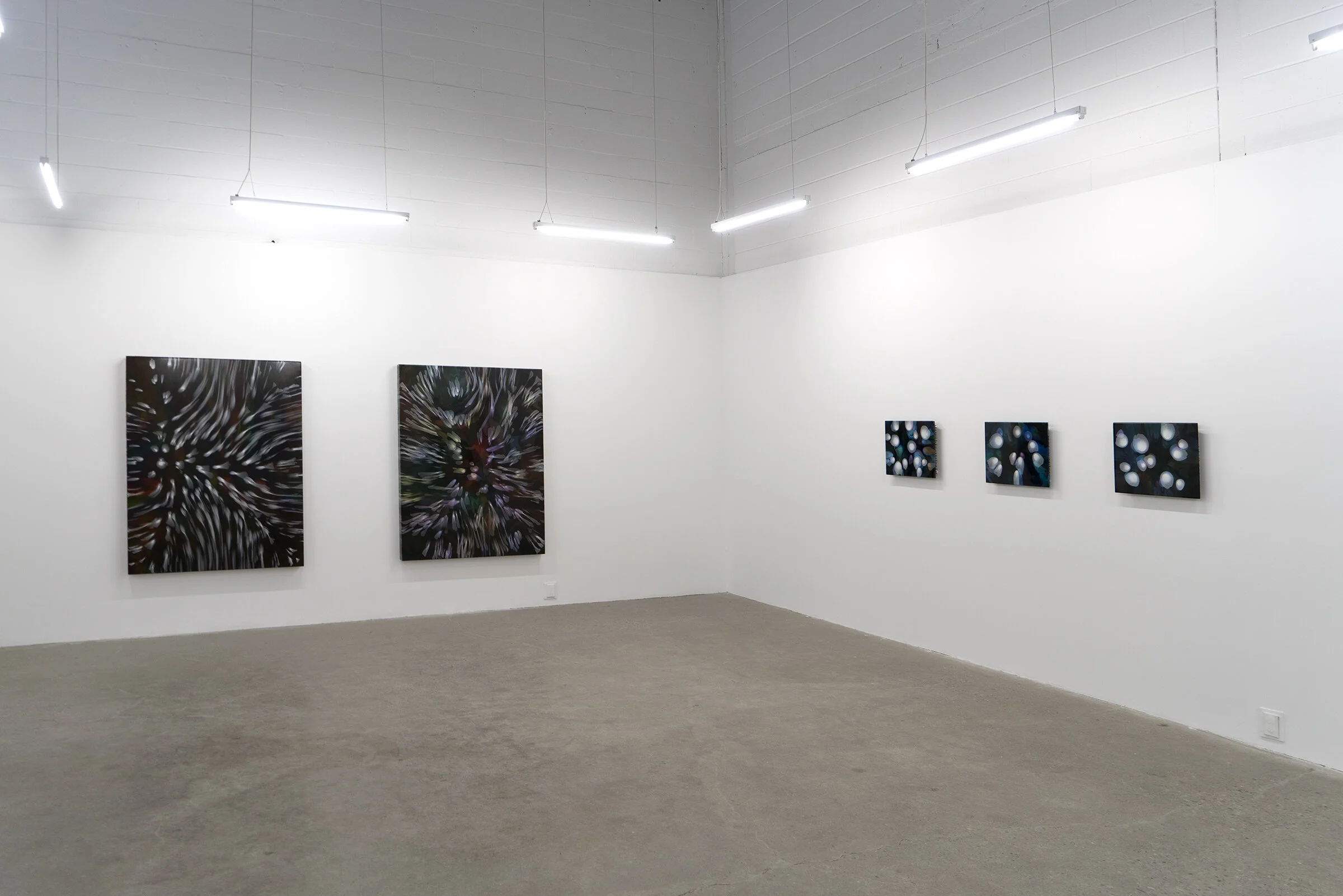 The visual outcome of this experiment is determined by an abundance of conditions and circumstances that are completely outside of the artist’s control: the temperature of the room, its humidity, the quantity of paint applied and the resulting drying time. These conditions are directly translated onto the surface of the painting. In this way, one can conceive of this series of paintings as a layered record of these successive studio sessions. Through this dynamic process, each new session becomes entangled with the previous ones - ultimately forming a resolved surface. Though the painting exists as a fixed image, it nonetheless retains an evocative account of its fluid past state. One might even go as far as to envision underwater seascapes with flowing medusas. In this sense, these paintings offer a poetic account, portraying the suggestive potential of fluid pigments.